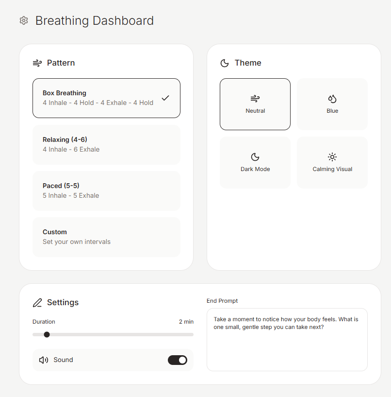 A breathing and grounding view turns a skill you already teach into something the client can run at home in a browser, without a separate subscription.