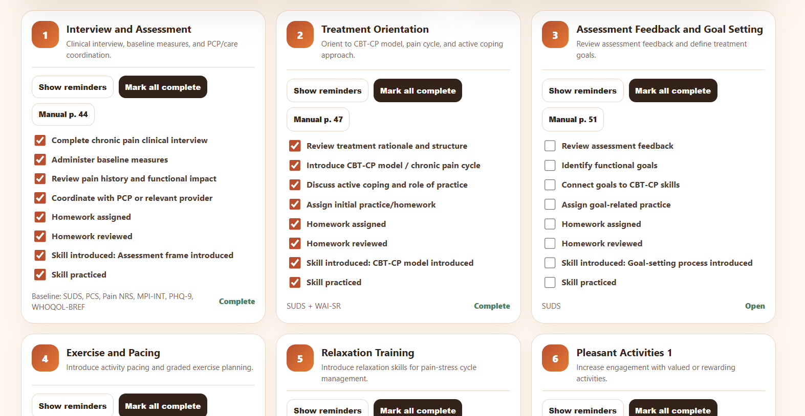 A protocol companion is a working checklist next to a manual. It is meant to sit with the VA CBT for Chronic Pain therapist manual. VA CBT-CP resources for providers list the current file. Download the official PDF, place it in the same folder as the HTML file as CBT-Chronic-Pain-Therapist-Manual_2025_508.pdf, or set the Manual link base field in the page to match your filename. The manual is not in these downloads. Progress stays in the browser. It is a workflow aid, not a chart.