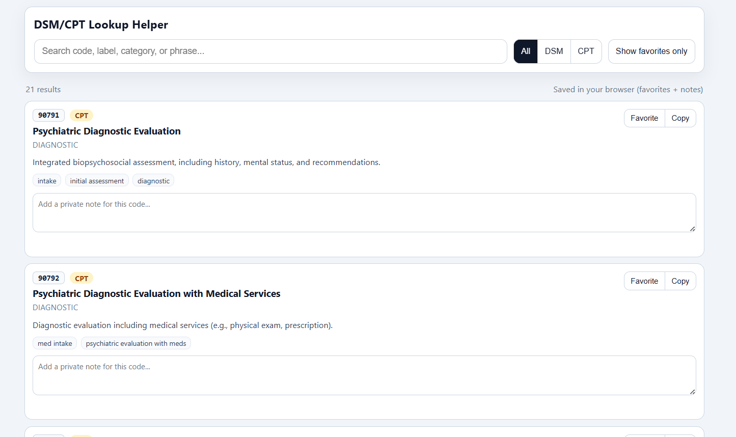 A lookup page is a private reference surface. The sample rows are placeholders. The useful part is the search, split between DSM-style and CPT-style lines, and space for your own short notes. The same build can back other lists, such as accommodations or internal procedures, if the data is yours to hold locally.