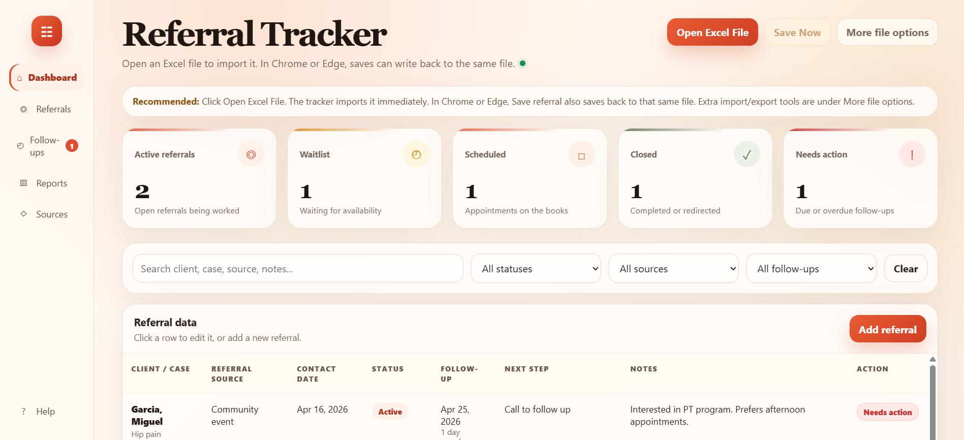 A referral tracker is a dashboard on top of a spreadsheet. The blank companion spreadsheet is a layout you can swap for your own file. The spreadsheet stays the system of record. The page is for follow-up dates, status, and what needs doing next, especially in Chrome or Edge where the tool can write back to the file you opened.
